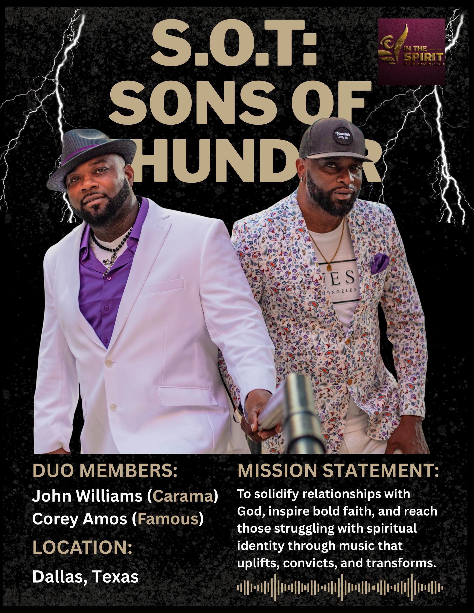 Sons of Thunder, John Williams (Carama) and Corey Amos (Famous). A gospel duo from Dallas, Texas. The DUO set out to solidify relationships God, inspire bold faith, and reach those struggling with spiritual identity through music that uplifts, convicts and transforms.